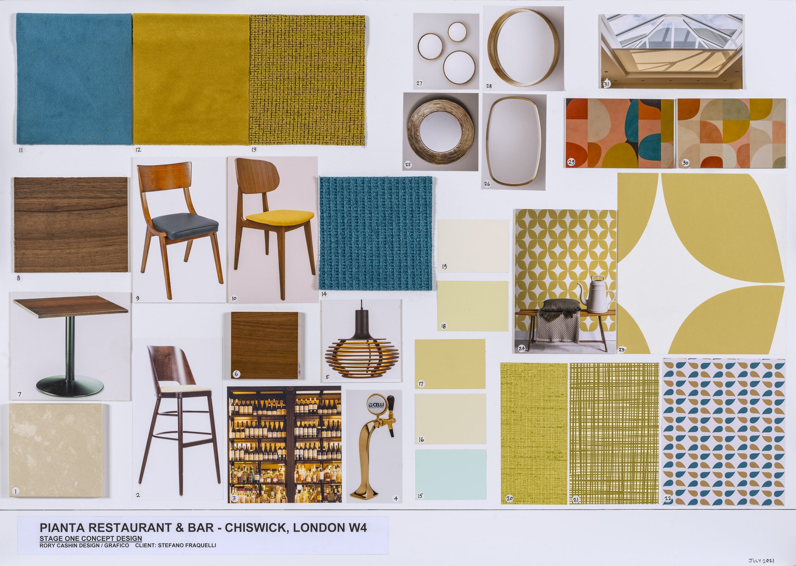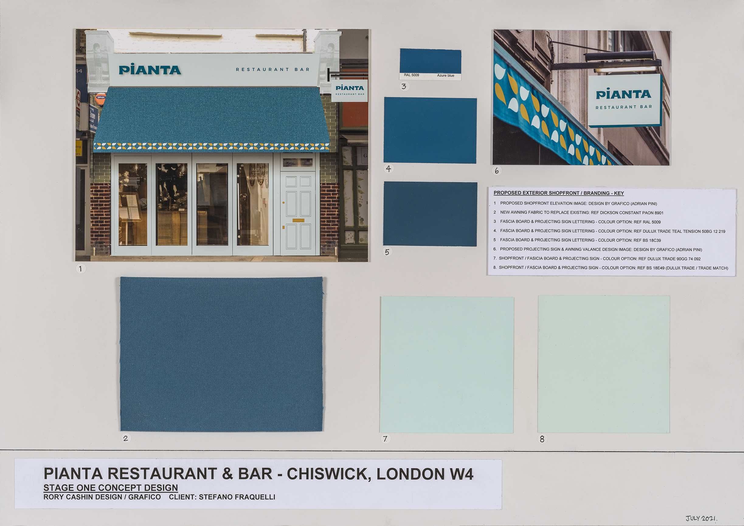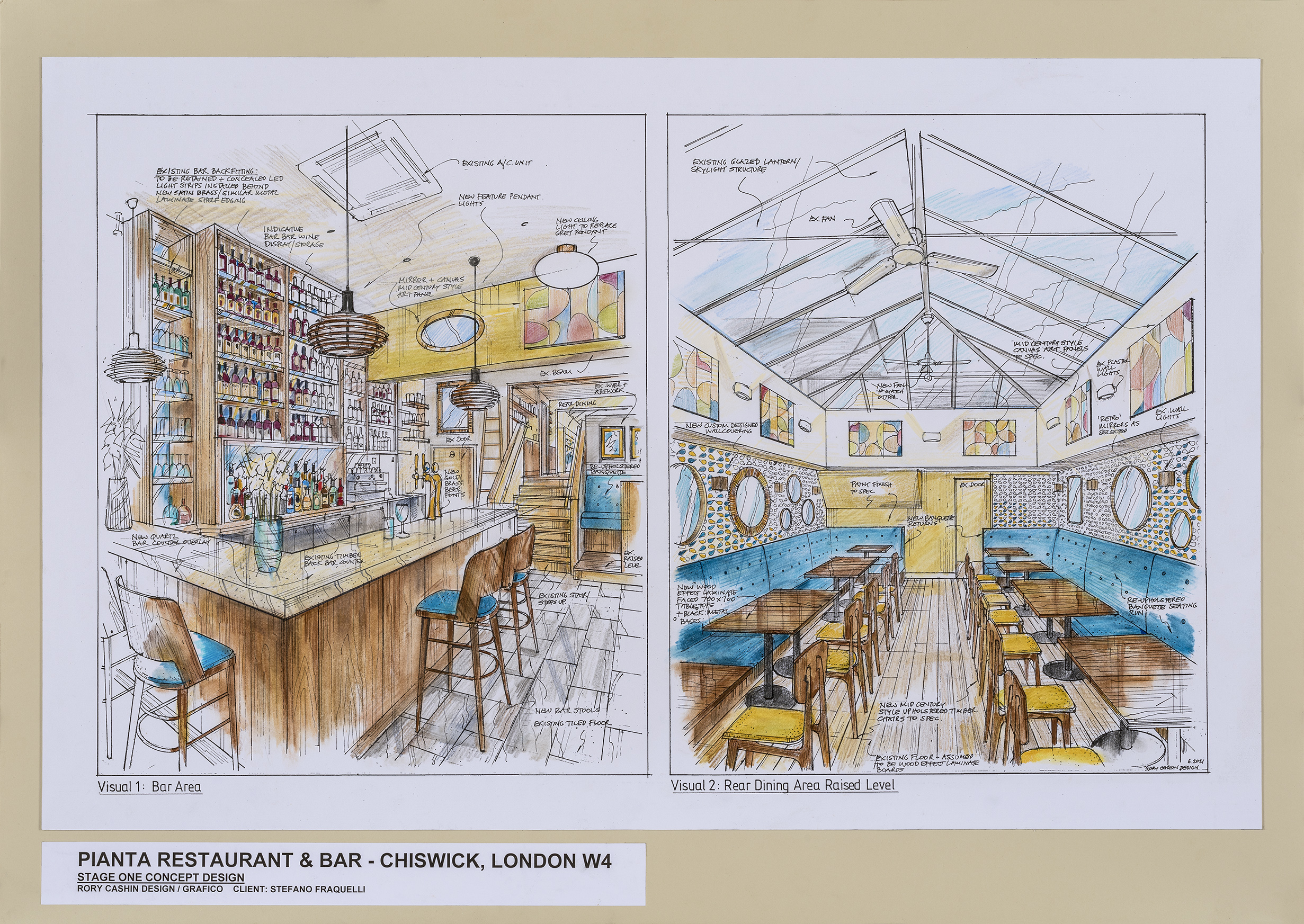 We were briefed by a London based restaurateur to develop a concept – on a limited budget – for an italian casual dining restaurant and bar in an existing narrow site. In collaboration with branding designers Grafico, the name ‘Pianta’ was created to reflect the plant based menu. Concept included new shopfront designs, custom printed wallcovering, mid century furniture, banquette seating and lighting. Presented layout plans, visuals sample boards and budget costings. Scheme fitted out. Site now under new ownership.